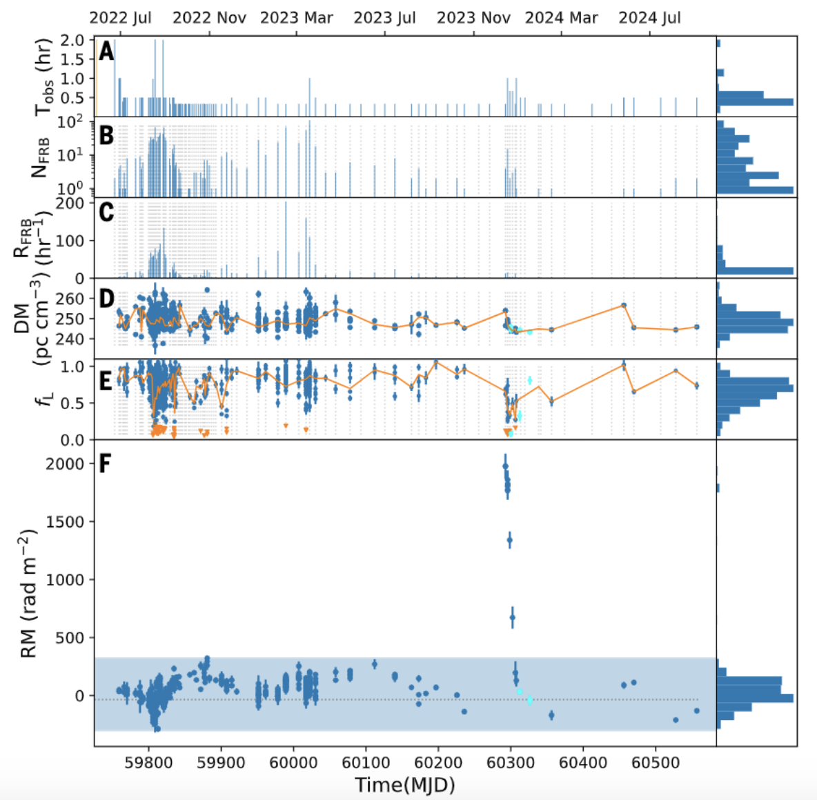 图1. 快速射电暴FRB 20220529的法拉第旋转量时间演化图。2023年底,该源的法拉第旋转量出现20倍的急剧跳变,随后在两周内回落至正常水平,清晰记录了磁化等离子体云穿过观测视线的全过程,为双星起源假说提供了直接证据。